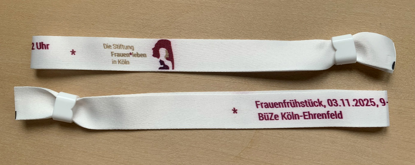 Wir haben dafür Einlassbändchen drucken lassen, die wir bei den Anlaufstellen und Streetworker*innen abgeben, damit diese sie zeitnah an wohnungslose Frauen verteilen können. Gerne weitersagen – aber ausschließlich wohnungslose Frauen sind geladen.