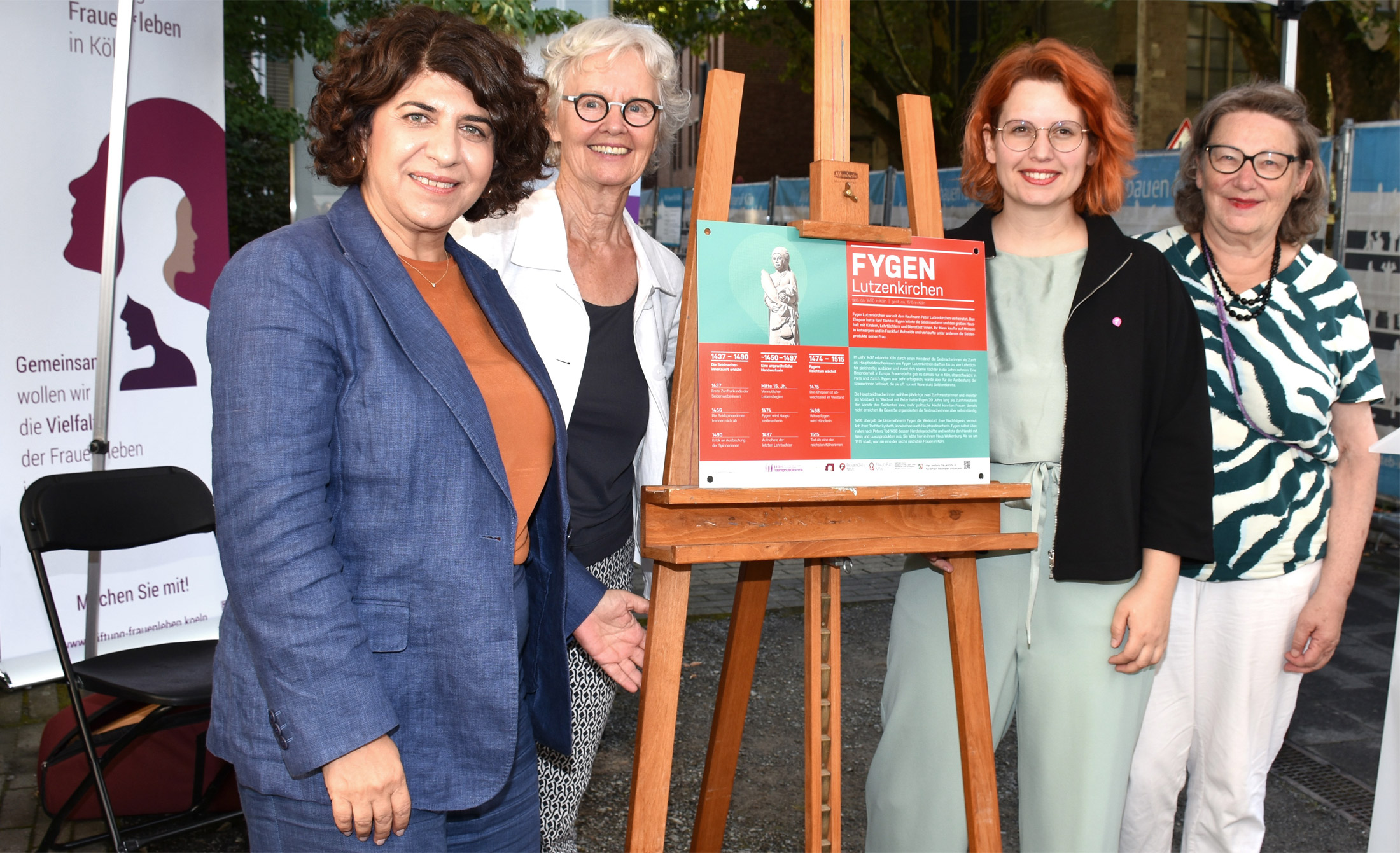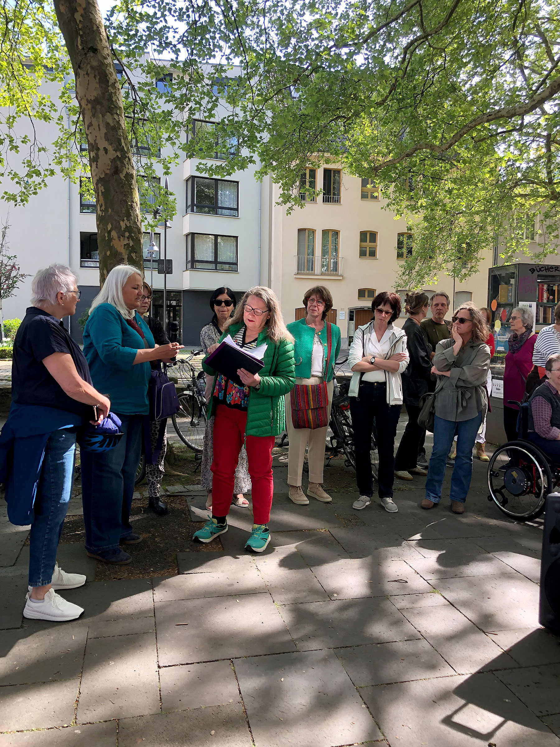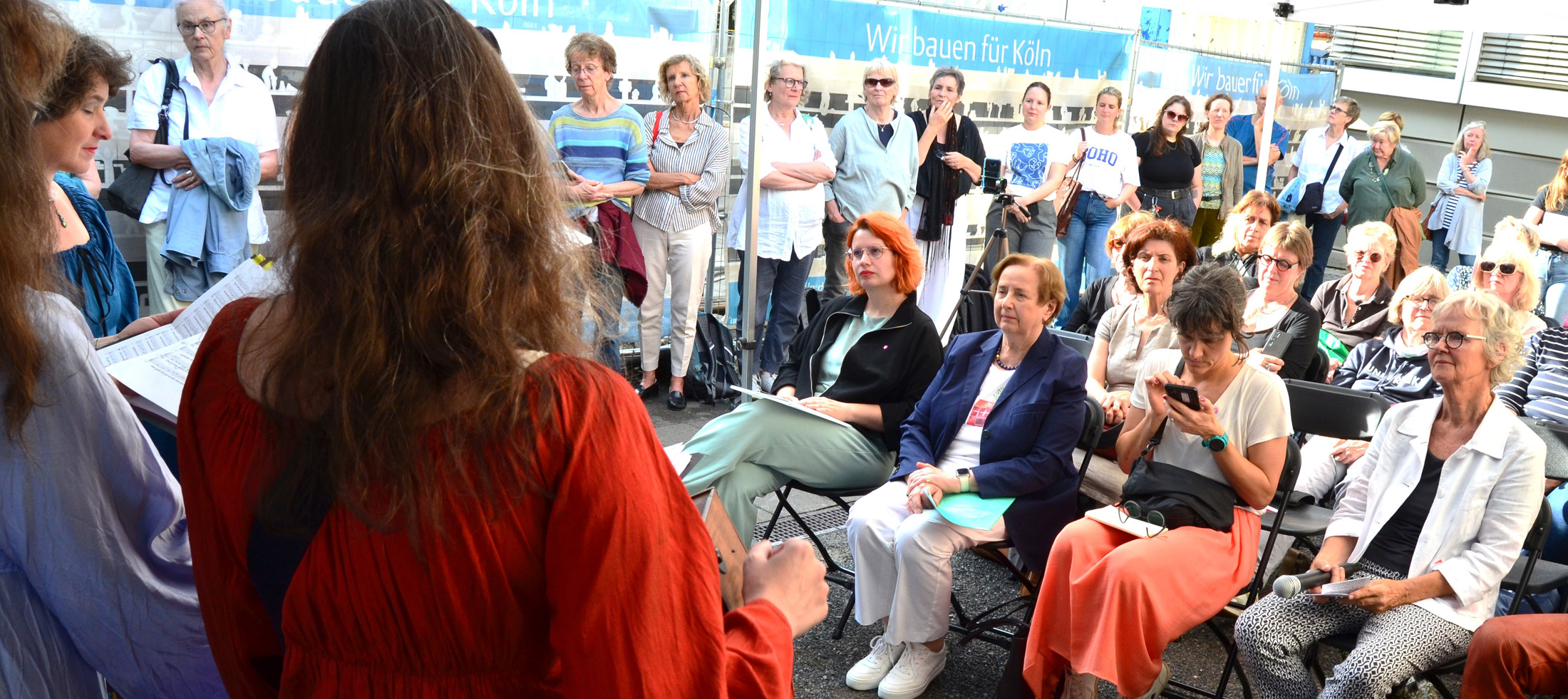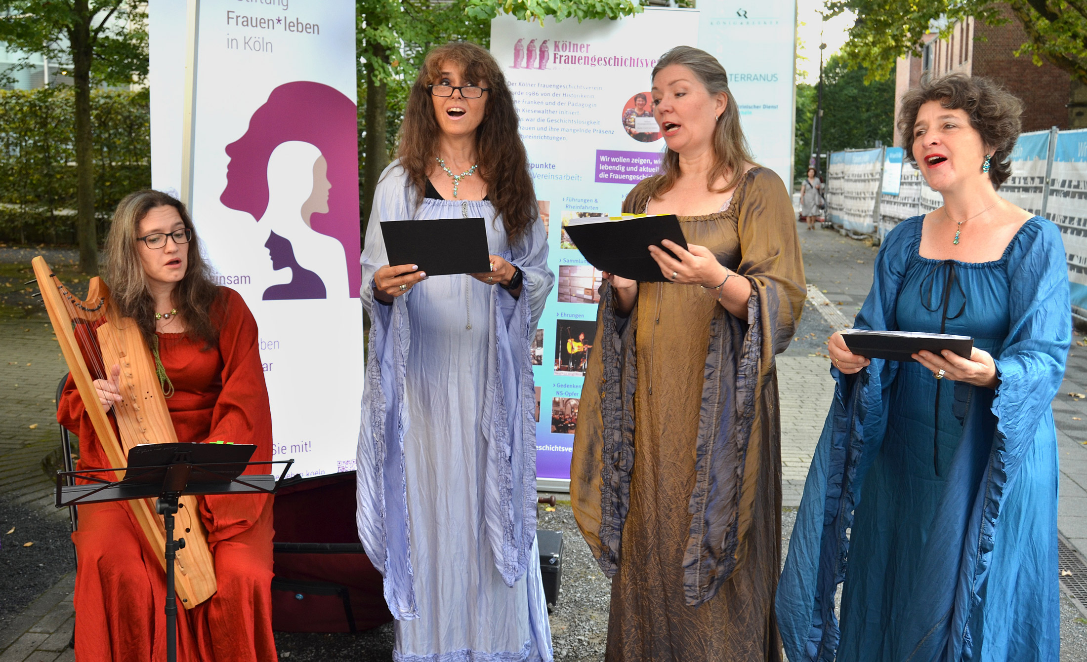 Doch die Eröffnungsfeier fand statt und das Wetter spielte – nach einem vorausgegangenen Gewitter – mit. Das Musikensemble Ars Choralis Coeln (Stefanie Brijoux – Gesang, Harfe, Drehleier Sylvia Dörnemann – Gesang Pamela Petsch-Szabanowski – Gesang, Trommel und Glocken Cora Schmeiser – Gesang und Drehleier) führte das Publikum mit wunderbarer Alter Musik in das frühe 16. Jahrhundert zurück. Berîvan Aymaz als Vizepräsidentin des Landtags von NRW und Sarah Gonschorek aus dem Vorstand des FrauenRates NRW sprachen nachdenkliche Grußworte. Dann erläuterte Frau Prof.in Dr.in Margret Wensky kenntnisreich und humorvoll, was wir heute über das Leben von Fygen Lutzenkirchen wissen. Schließlich führte Irene Franken aus, wie es um die Sichtbarkeit von Frauen im Kölner Stadtbild bestellt ist. Da ist noch viel Luft nach oben, die wir uns erobern können!