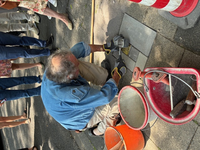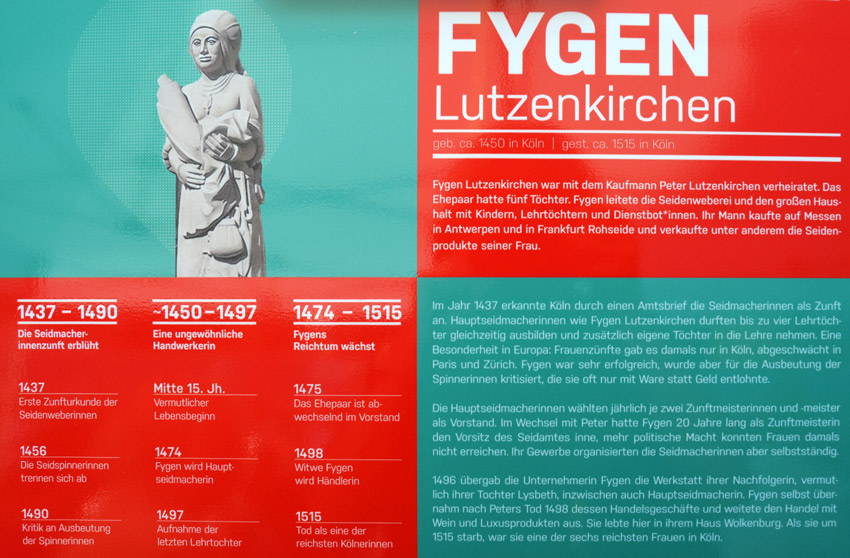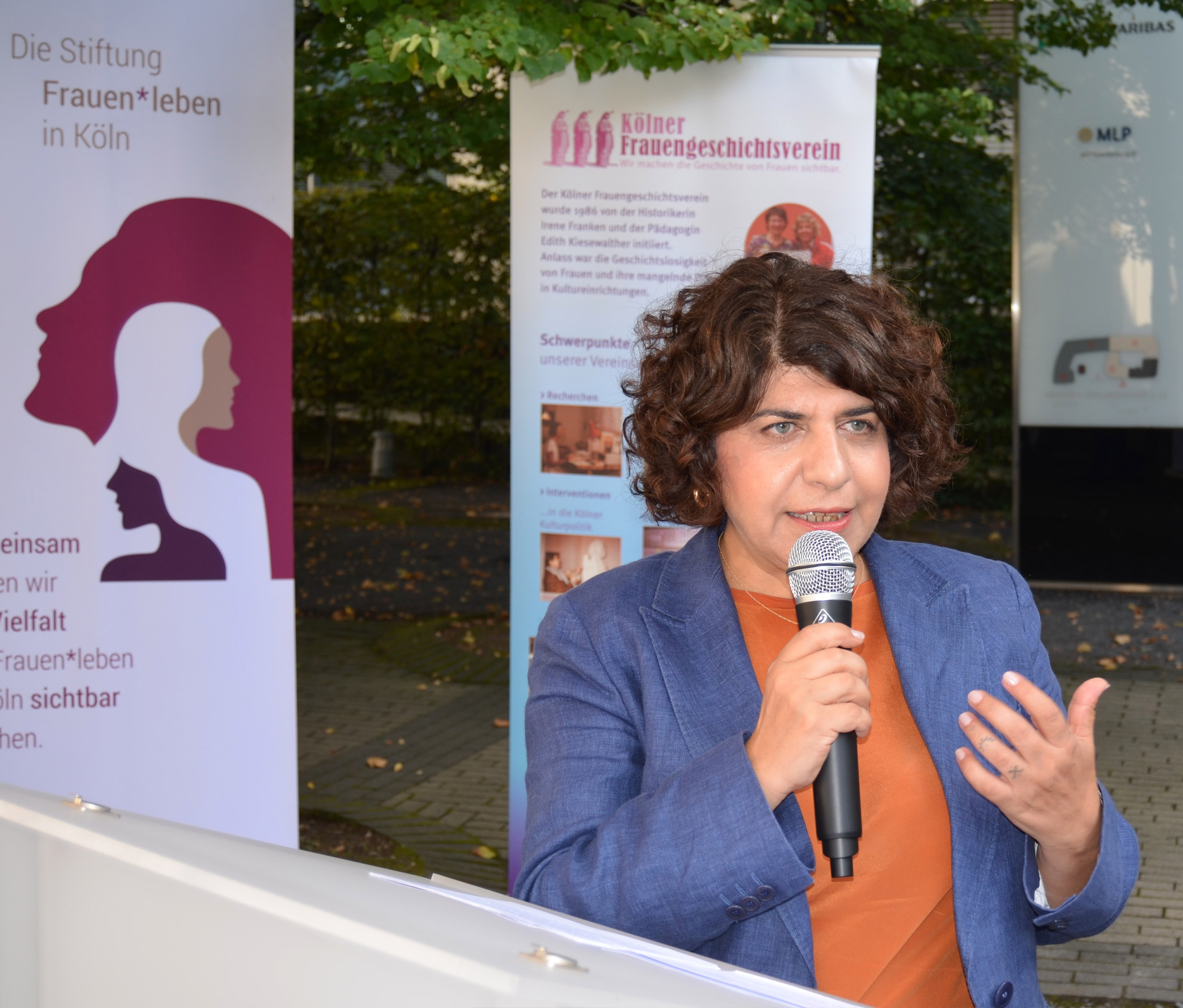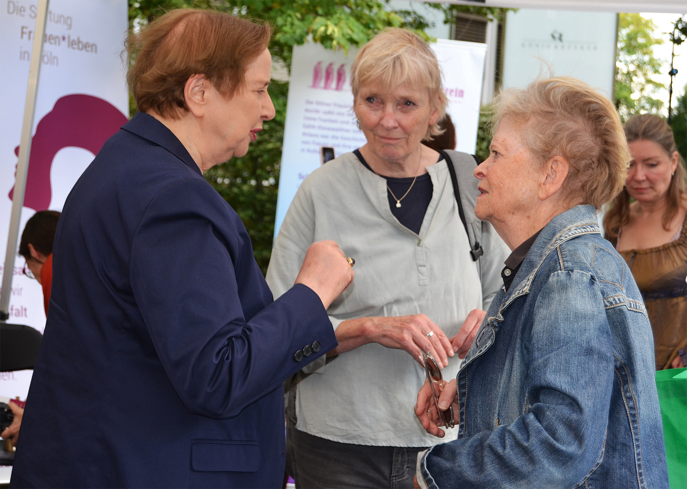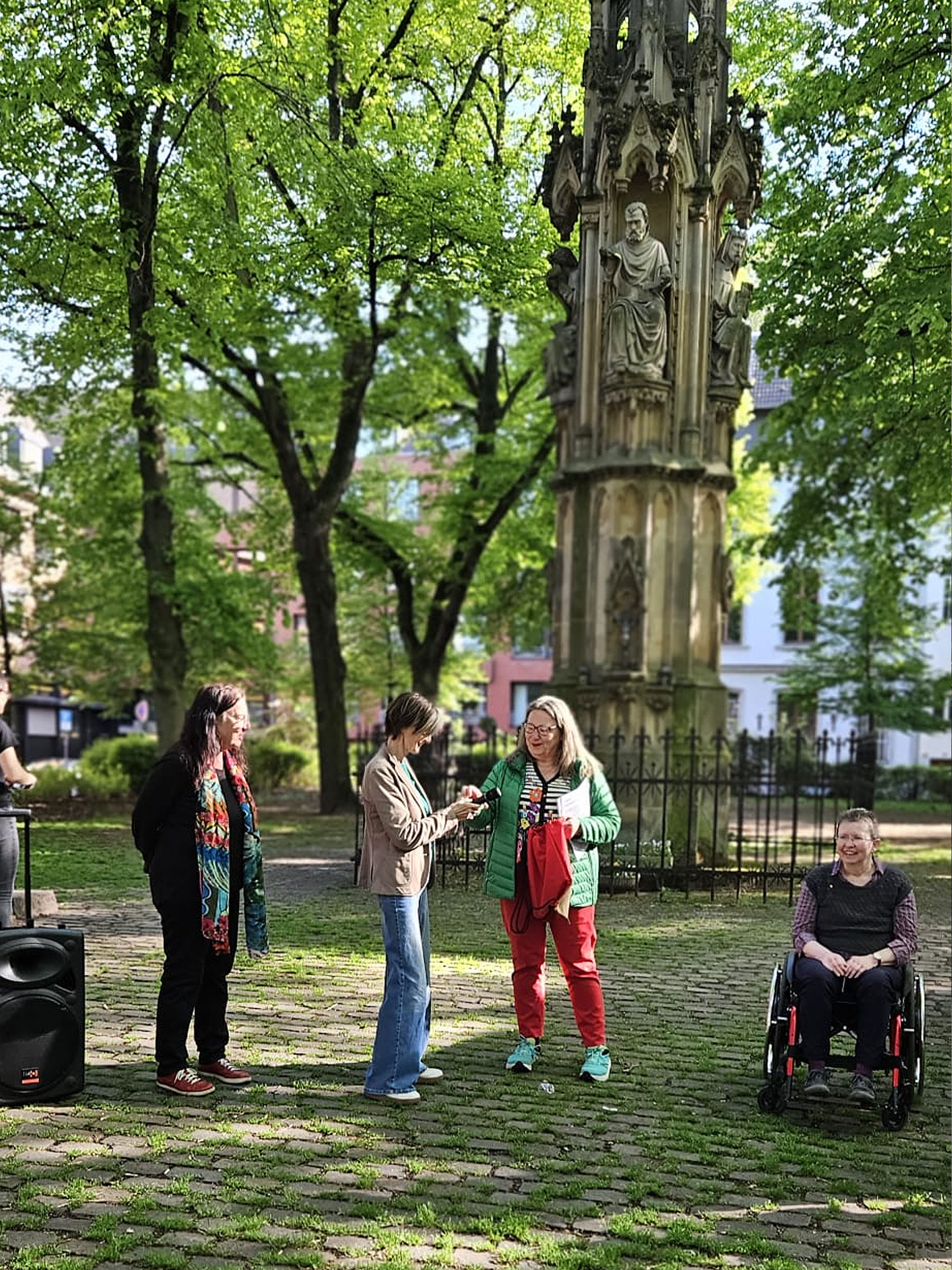 Doch die Eröffnungsfeier fand statt und das Wetter spielte – nach einem vorausgegangenen Gewitter – mit. Das Musikensemble Ars Choralis Coeln (Stefanie Brijoux – Gesang, Harfe, Drehleier Sylvia Dörnemann – Gesang Pamela Petsch-Szabanowski – Gesang, Trommel und Glocken Cora Schmeiser – Gesang und Drehleier) führte das Publikum mit wunderbarer Alter Musik in das frühe 16. Jahrhundert zurück. Berîvan Aymaz als Vizepräsidentin des Landtags von NRW und Sarah Gonschorek aus dem Vorstand des FrauenRates NRW sprachen nachdenkliche Grußworte. Dann erläuterte Frau Prof.in Dr.in Margret Wensky kenntnisreich und humorvoll, was wir heute über das Leben von Fygen Lutzenkirchen wissen. Schließlich führte Irene Franken aus, wie es um die Sichtbarkeit von Frauen im Kölner Stadtbild bestellt ist. Da ist noch viel Luft nach oben, die wir uns erobern können!