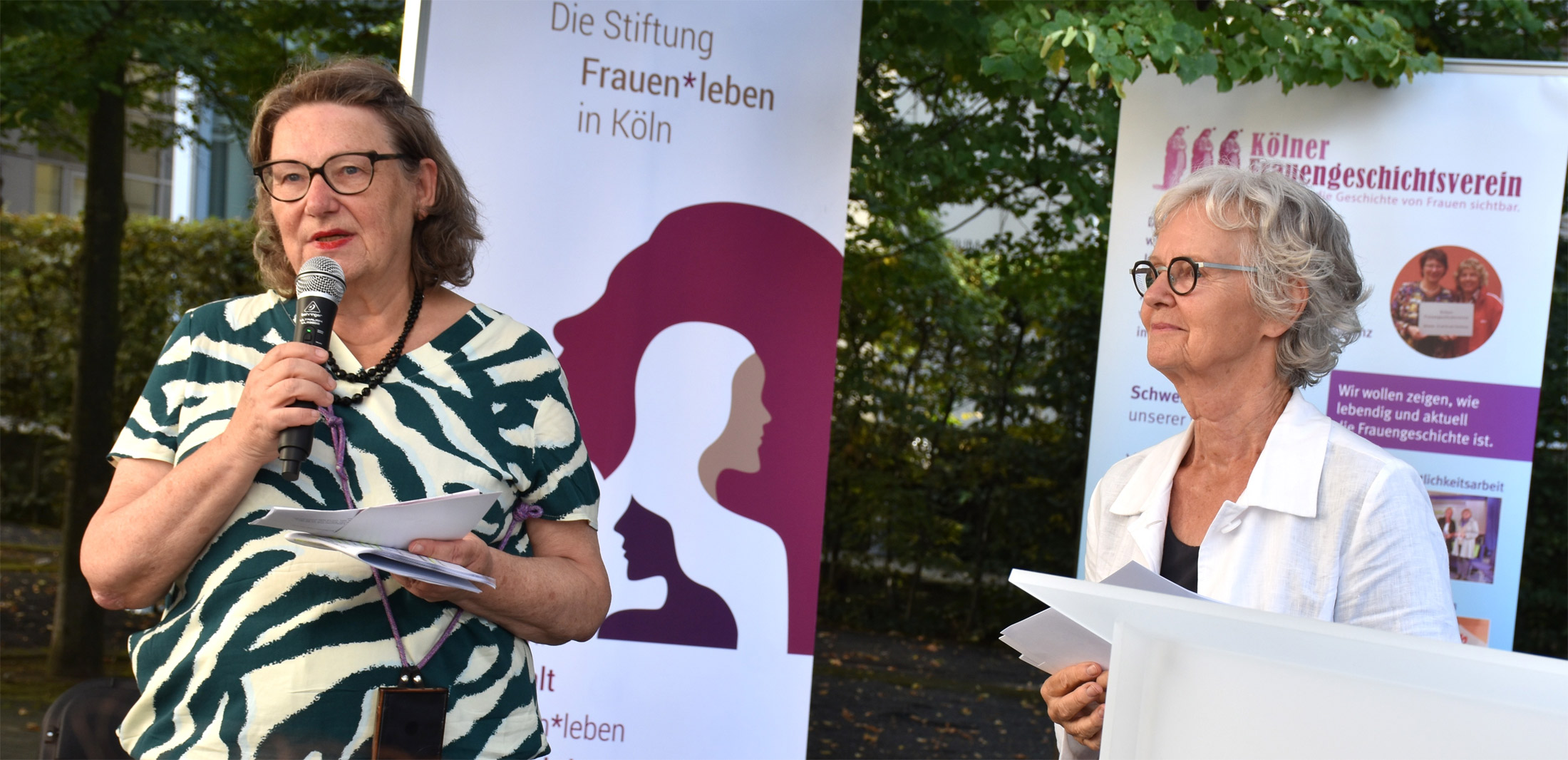 Sprichwörtlich bis zur letzten Minute wussten die Organisatorinnen dieses zweiten FrauenOrtes NRW in Köln, Irene Franken vom Kölner Frauengeschichtsverein und Maria Beckermann von der Stiftung Frauen*leben in Köln, nicht, ob und wo die Eröffnungsfeier stattfinden könnte. "Es war ein einziger Hindernislauf", sagt Maria Beckermann, "und das seit über einem halben Jahr". Durch die umfangreichen Auflagen konnte die Stele nicht rechtzeitig aufgebaut werden, so dass als Provisorium die Tafel für Fygen Lutzenkirchen auf einer Staffelei aufgestellt wurde.