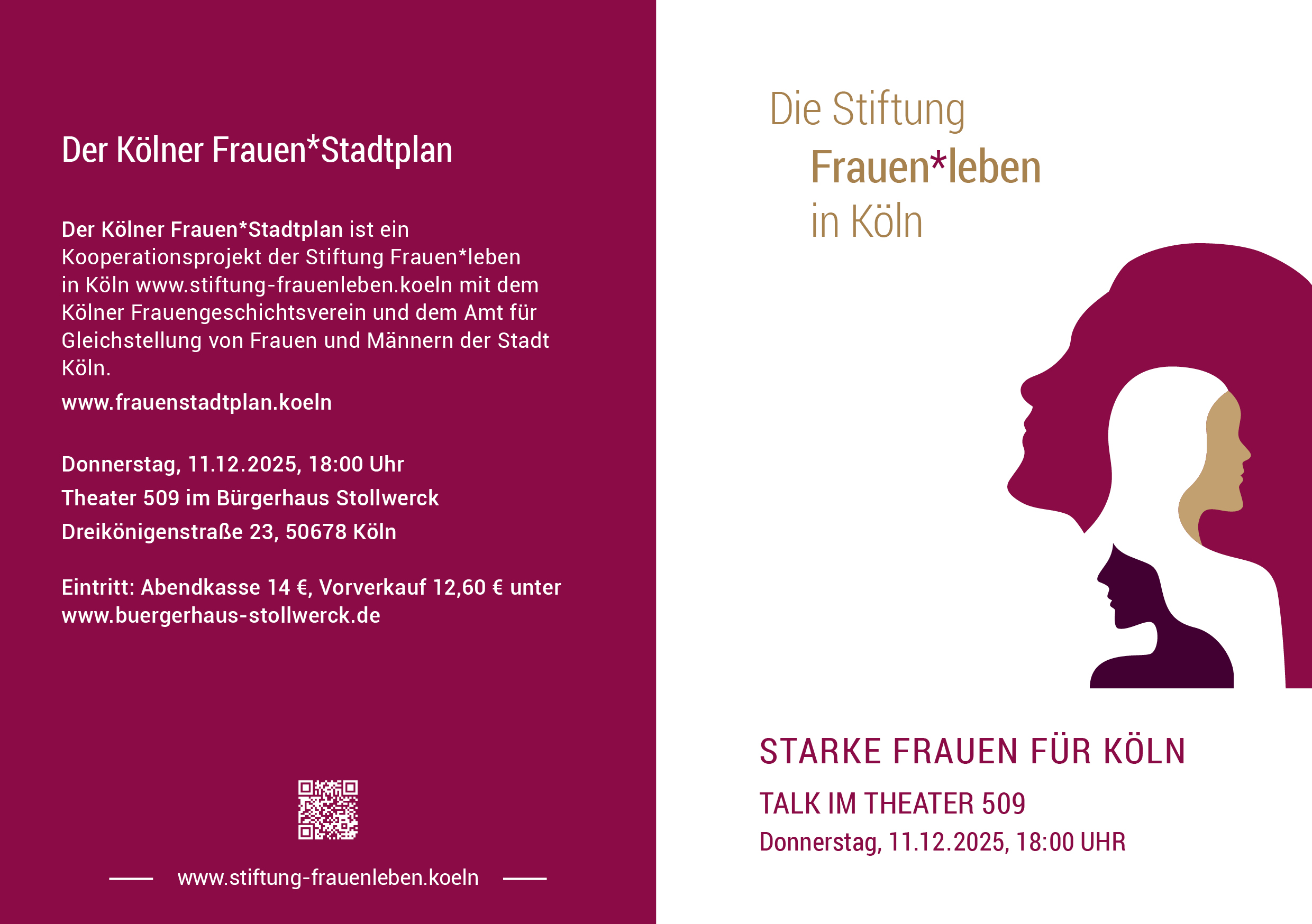 Für den nächsten TALK am Donnerstag, 11. Dezember 2025 im Theater 509 im Stollwerck werden die ehemalige Dombaumeisterin Prof.in Dr.in Barbara Schock-Werner, die Performance-Künstlerin Angie Hiesl und Martina Böhmer, Gründerin von Paula e.V., auf dem Podium sitzen. Carolina Brauckmann wird die drei innovativen Frauen aus dem Kölner Frauen*Stadtplan zu ihrem Leben, ihren Erfahrungen und Einsichten befragen. Flyer von der Veranstaltung