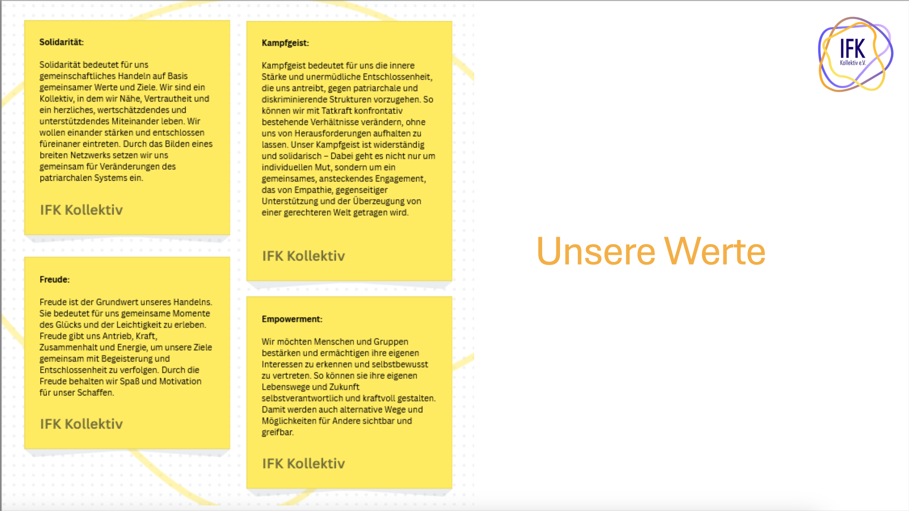 Die Stiftung Frauen*leben in Köln unterstützt die jungen Frauen sowohl durch Mentoring als auch finanziell, weil wir Stifterinnen die Werte, die das IFK für sich herausgearbeitet hat, teilen: Freude, Empowerment, Kampfgeist und Solidarität.