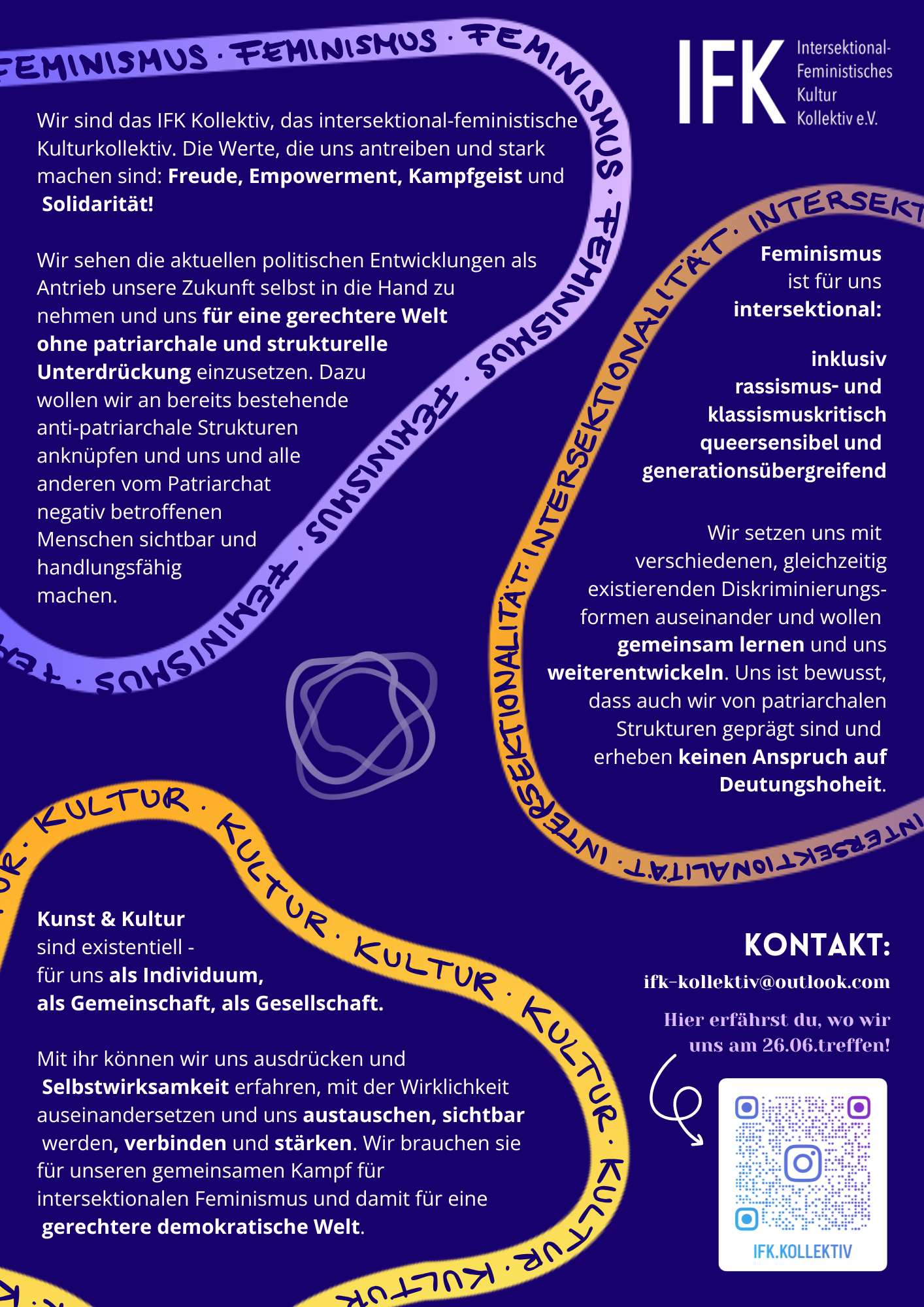 Am 26.06.2025 fand die erste öffentliche Mitgliederversammlung des IFK (Intersektionales Feministisches Kultur Kollektiv) in der Alten Feuerwache statt. Milla, Kira und Helen (von rechts nach links) stellten ihren Verein und ihre Pläne mit so viel Enthusiasmus vor, dass der Verein am Ende der Veranstaltung 10 neue Mitglieder hatte.