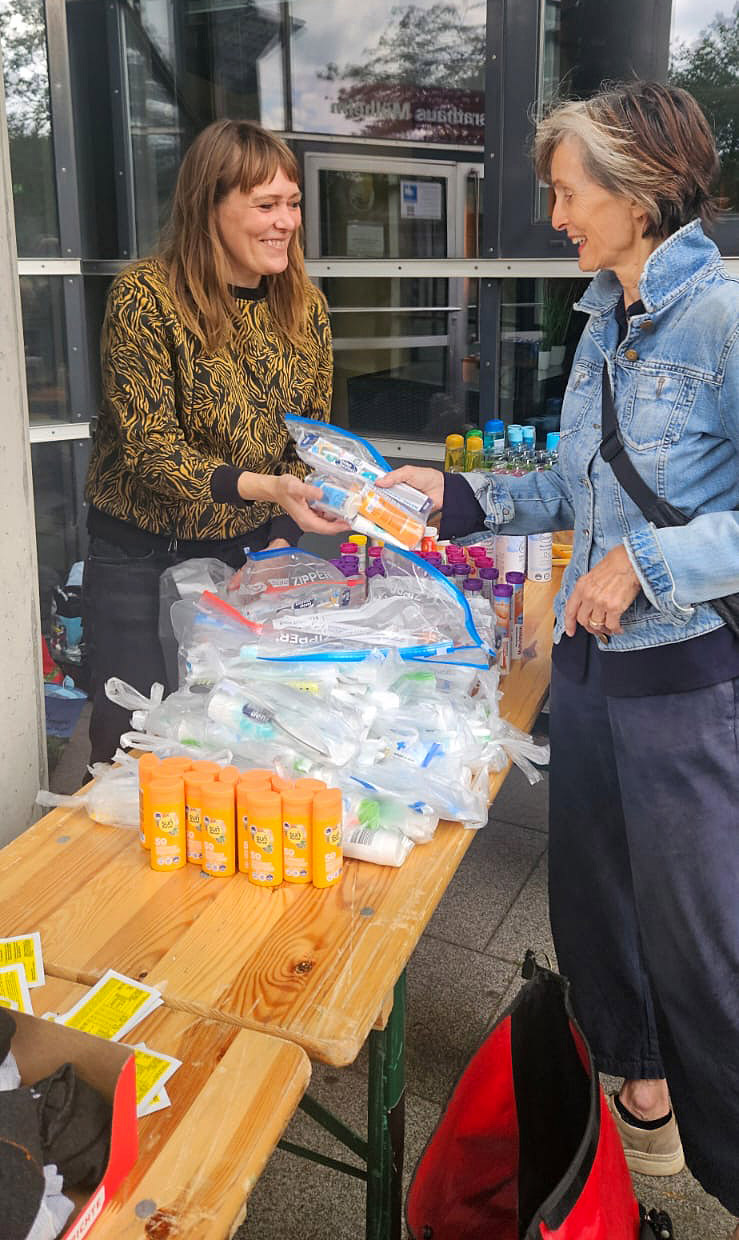 Anne Gutzmann besuchte das Sommerfest von HiK ( Heimatlos in Köln) auf dem Wiener Platz in Mülheim, dem Verein, mit dem Linda Rennings überwiegend wohnungslose Frauen unterstützt. Sie hatte sich von uns Hygiene-Artikel für die wohnungslosen Frauen gewünscht.